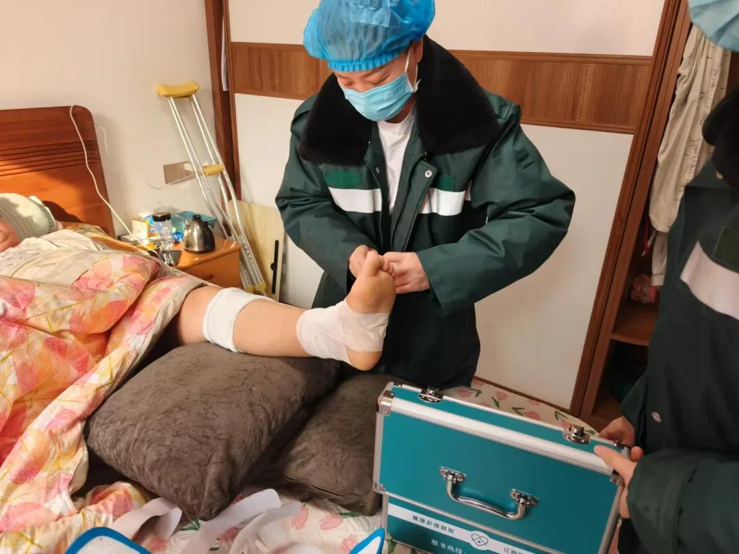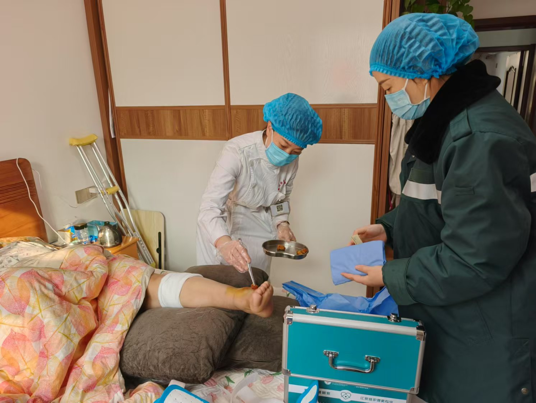 接到任務(wù)后,張燕燕護士長帶領(lǐng)科室主管護師孟丹丹一起按照約定時間上門服務(wù),在對患者做了系統(tǒng)的傷口評估后,嚴格按照操作標準,動作輕柔又利落地對傷口進行了創(chuàng)面消毒、換藥、包扎,同時耐心為患者及家屬講解了傷口居家護理的注意事項及患肢的功能鍛煉要點等。
