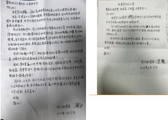 在漯河醫(yī)專二附院泌尿-肛腸外科全體醫(yī)護(hù)人員的精心治療和悉心照料下,患者術(shù)后恢復(fù)良好,順利出院。出院之際,患者特意寫下兩張感謝信,分別贈予閆衛(wèi)甫主任團(tuán)隊(duì)和護(hù)理團(tuán)隊(duì)。信中,老人深情地寫道:“你們用專業(yè)的技術(shù),耐心的關(guān)懷,讓我再在病痛中感到了安心,看到了希望,你們不僅用醫(yī)術(shù)守護(hù)健康,更用真誠撫慰了患者的心靈。”(盧闖 田向榮 劉旭 袁錦鈺)