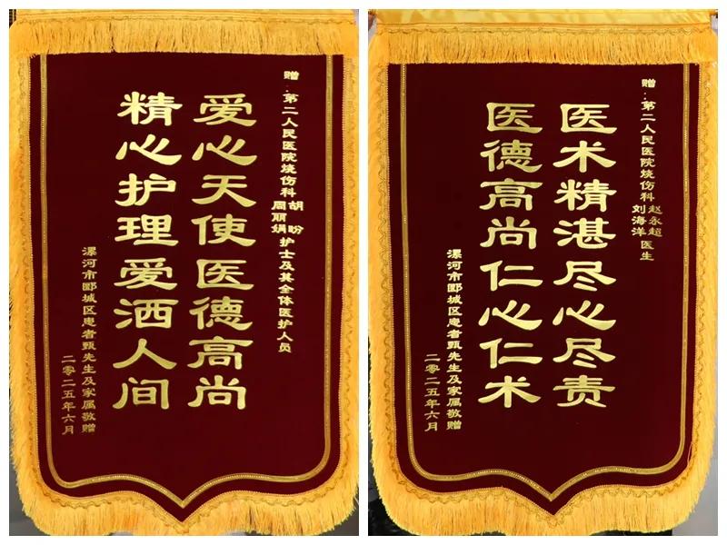 住院的日子里,每一天都讓患者感受到溫暖,每一名醫(yī)生,每一名護(hù)士,都讓他難忘。在出院時,患者及家屬激動不已:“沒想到我會恢復(fù)這么快,感謝你們的精湛醫(yī)術(shù),是你們給了我第二次生命!”為表示感謝,患者特地囑托身在外地的兒子定制了兩面錦旗,送至科室醫(yī)護(hù)手中。