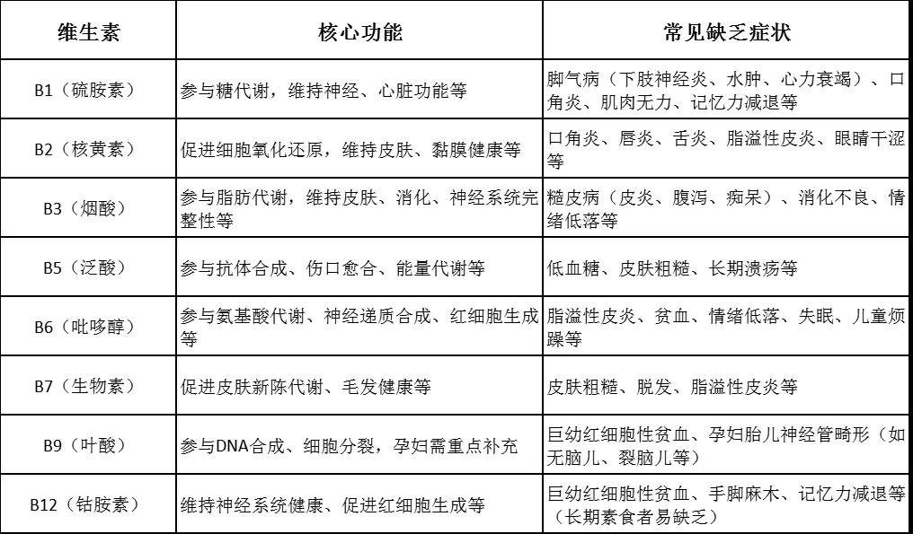 B族維生素是水溶性維生素家族,包括維生素B1(硫胺素)、B2(核黃素)、B3(煙酸)、B5(泛酸)、B6(吡哆醇)、B7(生物素)、B9(葉酸)、B12(鈷胺素)等8種人體必需成員。它們是糖、脂肪、蛋白質(zhì)代謝的關(guān)鍵輔酶構(gòu)成成分之一,參與神經(jīng)系統(tǒng)功能、皮膚健康、紅細(xì)胞生成等多個(gè)生理過程,缺乏會(huì)導(dǎo)致多系統(tǒng)疾病。
