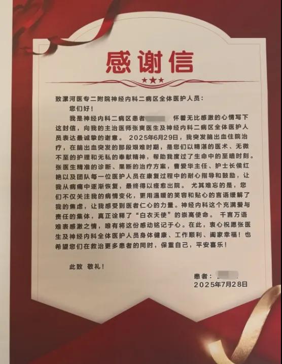 “你們不僅關(guān)注我的病情變化,更用溫暖的笑容和貼心的言語緩解了我的焦慮,讓我感受到醫(yī)者仁心的力量。”康復(fù)出院后,患者及家屬攜錦旗與感謝信再次來到醫(yī)院,他們把“以專業(yè)詮釋醫(yī)者擔當 用技術(shù)點亮生命希望”、“白衣執(zhí)甲護生命 溫情守心似親人”這樣的贊譽送給醫(yī)護人員,表達著對醫(yī)護團隊的認可,也彰顯了醫(yī)院多學(xué)科聯(lián)合會診機制,院前急救、院內(nèi)急診、院內(nèi)救治全流程閉環(huán)管理的顯著優(yōu)勢。