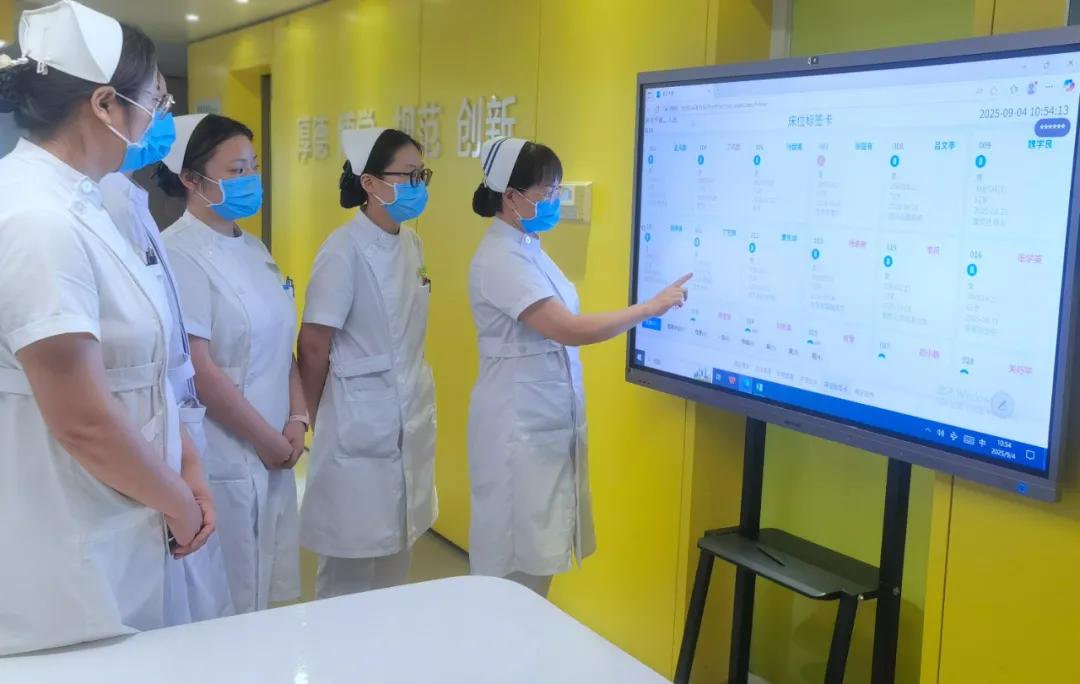護(hù)士站前,一場(chǎng)交班會(huì)正在進(jìn)行:智慧大屏上,患者信息實(shí)時(shí)更新,護(hù)理內(nèi)容分類顯示,重點(diǎn)項(xiàng)目一屏盡覽。告別傳統(tǒng)手寫(xiě)白板,降低人工轉(zhuǎn)抄差錯(cuò),大家通過(guò)點(diǎn)擊和切換不同場(chǎng)景,共同了解當(dāng)天的工作安排及注意事項(xiàng)。同時(shí),互動(dòng)大屏可以播放宣教資料,進(jìn)一步豐富健康教育形式。
