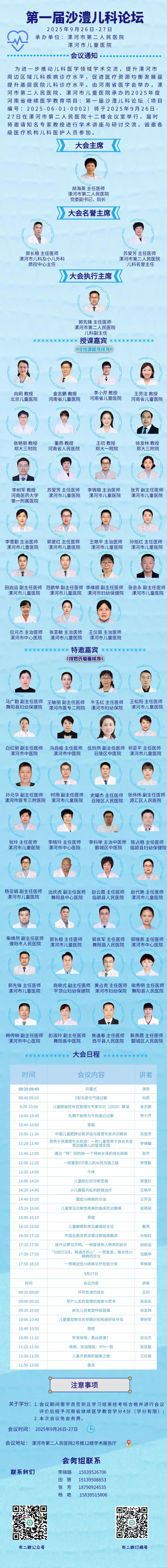 為進一步推動兒科醫(yī)學領域學術交流,提升我市及周邊區(qū)域兒科疾病診療水平,促進醫(yī)療資源均衡發(fā)展,提升基層醫(yī)院兒科診療水平。由河南省醫(yī)學會主辦,漯河市第二人民醫(yī)院、漯河市兒童醫(yī)院承辦的2025年度河南省繼續(xù)醫(yī)學教育項目:第1屆沙澧兒科論壇 (項目編號:2025-06-01-0002)學術會議將于2025年9月26-27日在漯河市第二人民醫(yī)院舉行,現(xiàn)將有關事項通知如下: