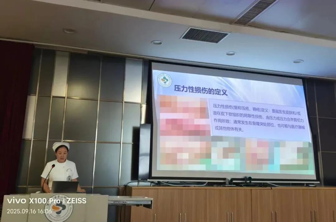 培訓(xùn)伊始,壓力性損傷/傷口護(hù)理學(xué)組會診干預(yù)組長張燕燕老師帶來關(guān)于《新型敷料在壓力性損傷中的應(yīng)用》的主題分享。她結(jié)合大量臨床案例,細(xì)致講解了各類新型敷料的材質(zhì)特性、適用場景,以及壓力性損傷不同分期對應(yīng)的敷料選擇策略、操作規(guī)范和效果評估方法。從水膠體敷料到泡沫敷料,從藻酸鹽敷料到銀離子敷料,張老師一一剖析,讓參訓(xùn)人員對新型敷料的臨床應(yīng)用有了更精準(zhǔn)、全面的認(rèn)識,為科學(xué)選擇和使用敷料提供了堅(jiān)實(shí)理論支撐。