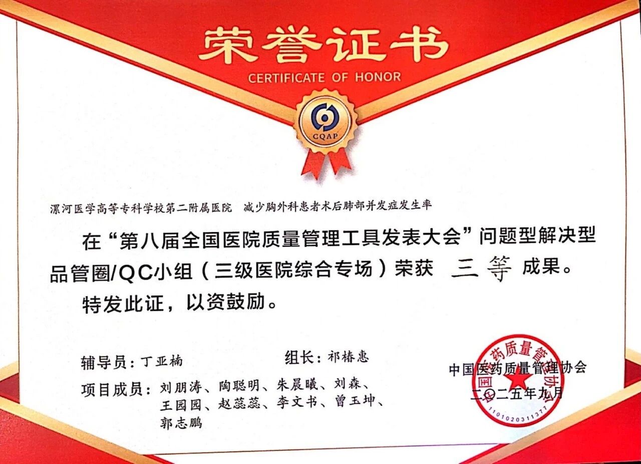 近日,第八屆醫(yī)院質量管理工具應用成果發(fā)表大會在重慶落幕。此次大賽共有來自全國的600多項課題參賽,其中413個項目入圍決賽,競爭激烈。 漯河醫(yī)專二附院(漯河市骨科醫(yī)院、漯河市立醫(yī)院)關節(jié)外科選送的RCA項目與胸外科選送的"非常好圈"品管圈項目,在各自專場中展現(xiàn)了扎實的專業(yè)素養(yǎng),最終在眾多優(yōu)秀團隊中勝出,分別斬獲二等獎和三等獎。