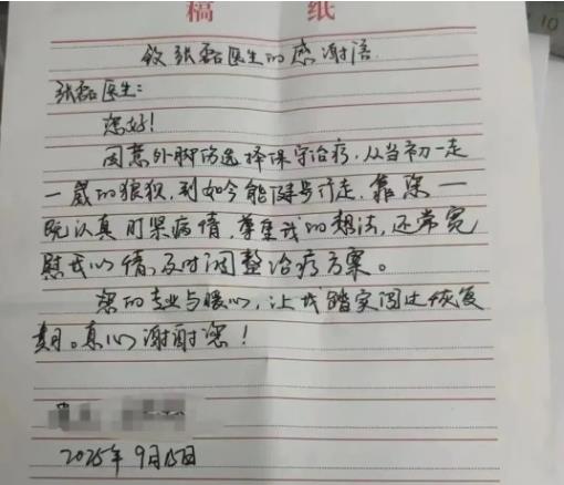 就這樣,在專業(yè)治療與耐心陪伴下,患者的腳踝一天天好轉(zhuǎn):從最初只能緩慢行走,到后來(lái)能正常上下樓梯,再到如今可以輕松散步——曾經(jīng)讓患者困擾不已的“老大難”問(wèn)題,終于徹底解決。出院那天,患者特意手寫(xiě)了這封感謝信,字里行間滿是真誠(chéng):“張醫(yī)生不僅治好了我的疼痛,更撫平了我心里的焦慮,這樣的好醫(yī)生,值得我們真心感謝!”