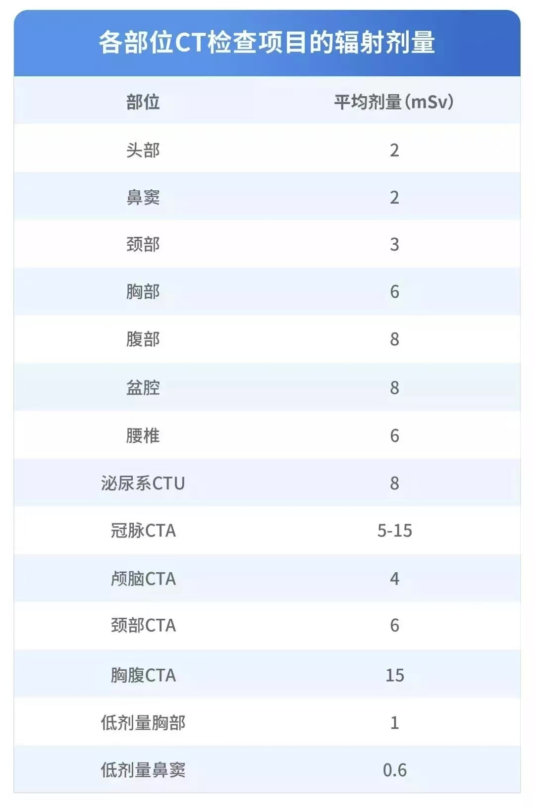 下圖是身體各個部位做CT檢查,承受的輻射劑量。我國規(guī)定放射工作人員年輻射劑量50mSv。
