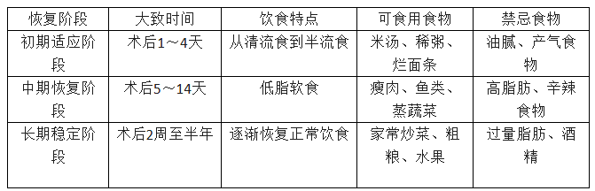 1.術(shù)后第1~2天,腸道功能尚未恢復(fù),此時(shí)通常需要禁食,待腸蠕動(dòng)恢復(fù)、肛門(mén)排氣后,可開(kāi)始進(jìn)食清流食。