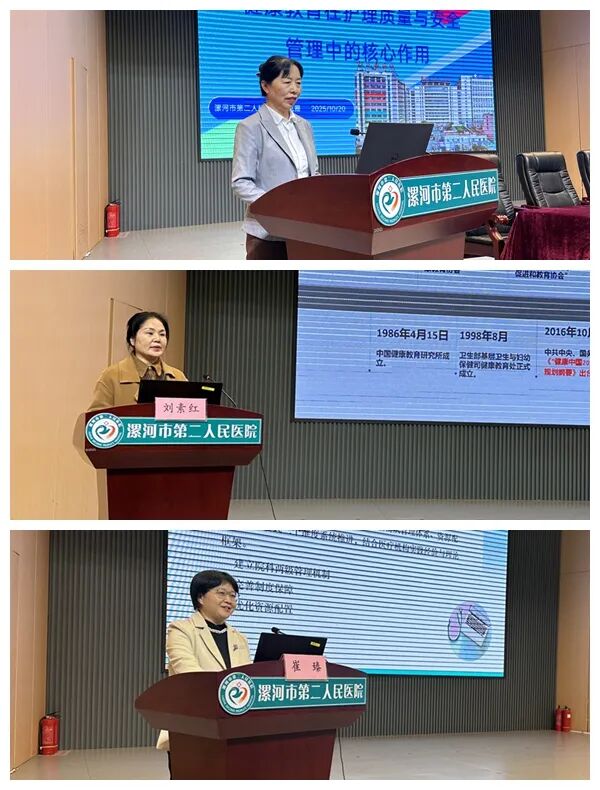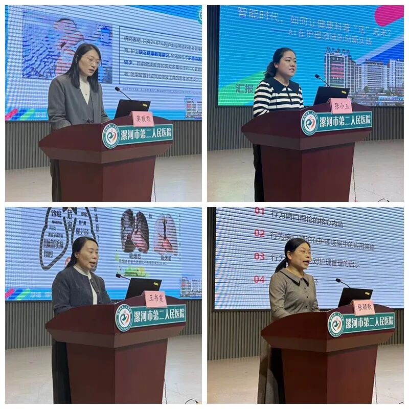 在學(xué)術(shù)交流環(huán)節(jié),多位護(hù)理專家圍繞健康教育的新理念、新方法與新技術(shù)展開深入探討。市二院護(hù)理部主任高凱霞分享了《健康教育在護(hù)理質(zhì)量與安全管理中的核心作用》;市中心醫(yī)院護(hù)理部副主任劉素紅講解了《基于賦能理論構(gòu)建三級醫(yī)院健康教育護(hù)士健康素養(yǎng)提升路徑》;市六院護(hù)理部副主任崔臻以《賦能·融合——構(gòu)建新時代醫(yī)院護(hù)理健康教育體系的實踐與思考》為題進(jìn)行交流;臨潁縣人民醫(yī)院護(hù)理部副主任張潁歌介紹了《基于行為窗口理論的護(hù)士高效能溝通技巧》;市二院普外科護(hù)士長王書霞圍繞《腫瘤患者營養(yǎng)與身心健康:吃出健康,動出活力》展開講解;麻醉手術(shù)部副護(hù)士長莫敬敬探討了《基于指南的靜脈治療健康教育及溝通模式》;小兒外科骨干護(hù)士張小玉則就《智能時代,如何讓健康科普“活”起來?——AI在護(hù)理領(lǐng)域的創(chuàng)新實踐》進(jìn)行分享。專家們結(jié)合臨床實例,展示了健康教育的最新成果與實踐經(jīng)驗,內(nèi)容充實,視角多元,為參會者帶來深刻啟發(fā)。