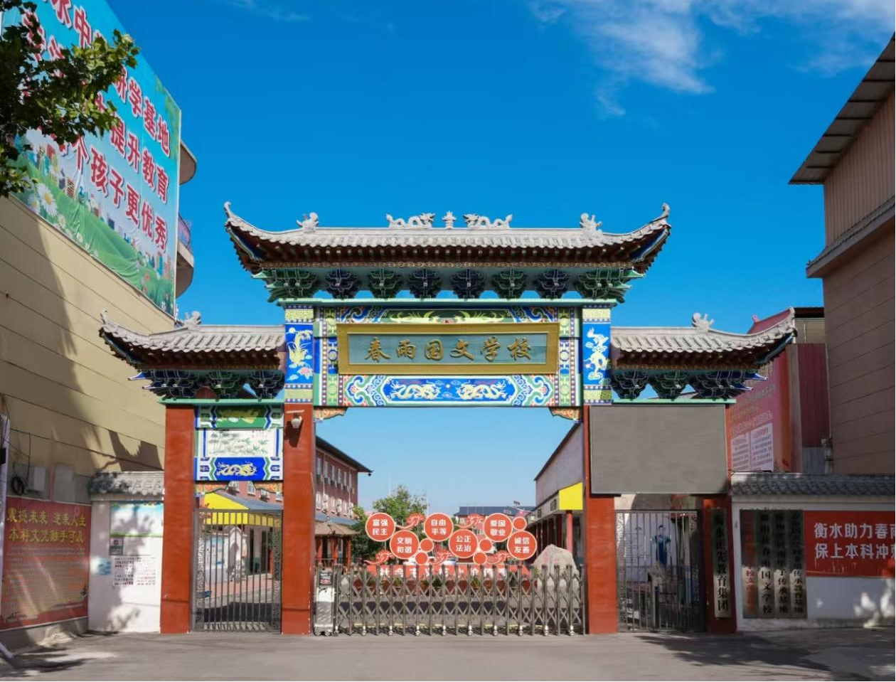 后來有一次到外地市去辦事,返程的時候恰好途徑舞陽縣城。這是個秋冬季節(jié),天很短,行駛到舞陽縣城時,天色還有些陰沉,而路燈還沒有亮。在這段黃昏來臨前的時間里,為了趕時間,我們的司機把車子開得很快。在人民路東段,在快要駛出這個縣城的時候,我不經(jīng)意間一扭臉,便望到了左前方路北臨街矗立著的舞陽春雨國文學(xué)校的大門了。