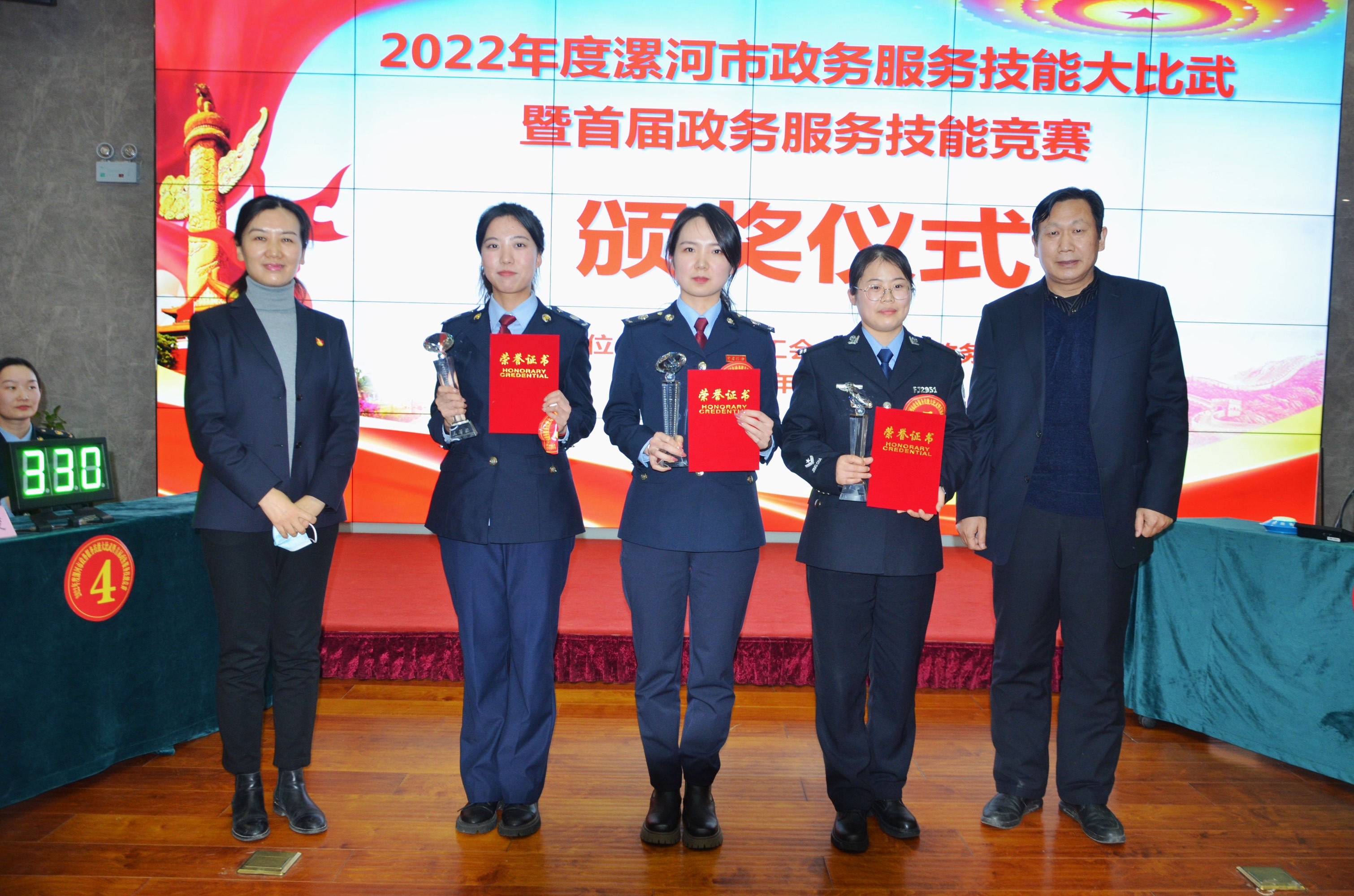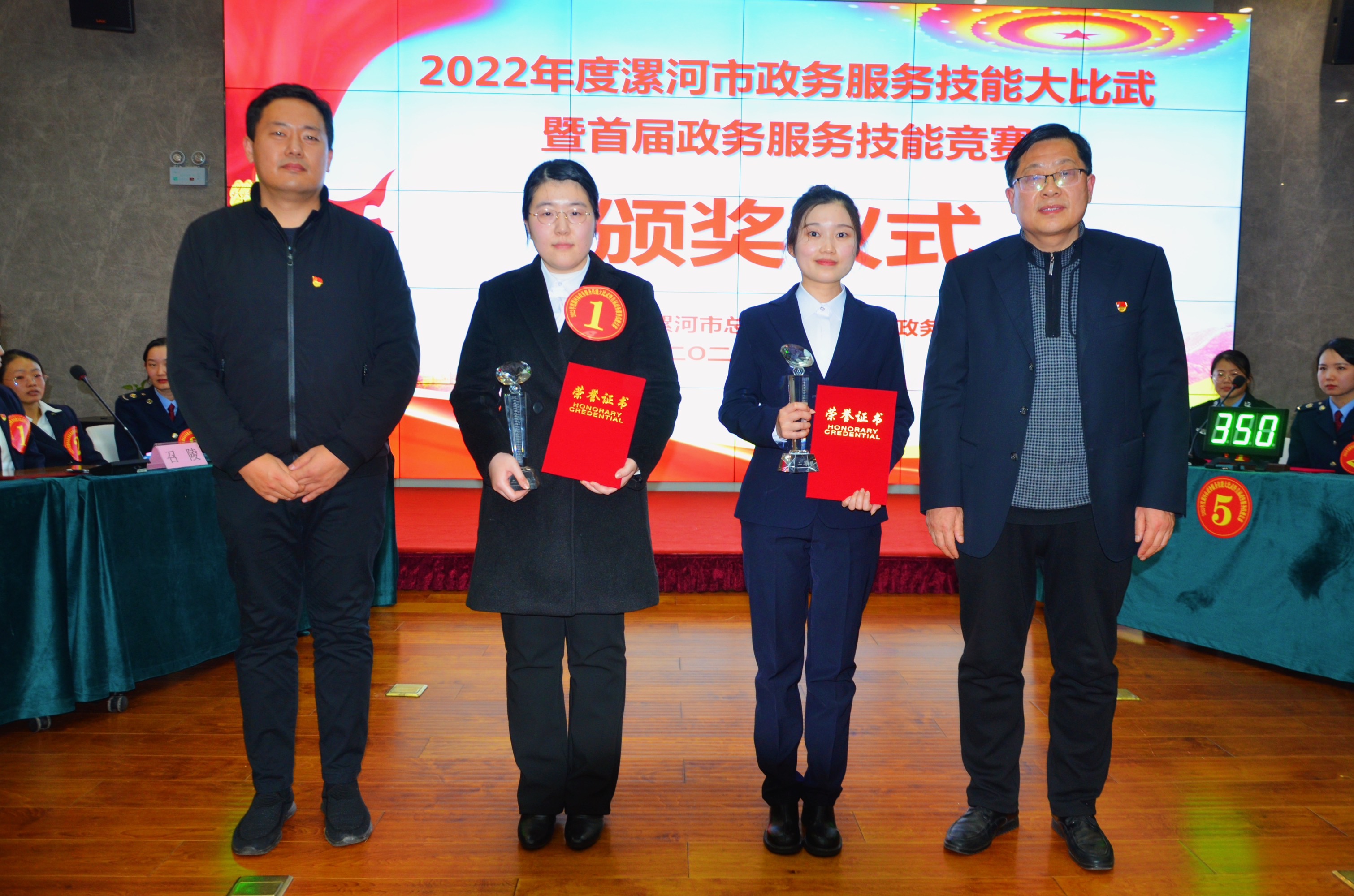 比賽中,各參賽代表隊(duì)奮勇爭先、激烈角逐;各參賽隊(duì)員在賽場上互相配合,充分發(fā)揮出團(tuán)隊(duì)的作用。最終,舞陽縣行政服務(wù)中心代表隊(duì)獲得團(tuán)體一等獎,張小麗同志獲得個人一等獎;召陵區(qū)行政服務(wù)中心、市政務(wù)服務(wù)中心人社公安稅務(wù)聯(lián)合隊(duì)2個代表隊(duì)獲得團(tuán)體二等獎,孟希瑞、黃丹2名同志獲得個人二等獎;郾城區(qū)行政服務(wù)中心、臨潁縣行政服務(wù)中心、經(jīng)濟(jì)技術(shù)開發(fā)區(qū)行政服務(wù)中心、3個代表隊(duì)獲得團(tuán)體三等獎,劉玉、劉暢、范亞男3名同志獲得個人三等獎;舞陽縣行政服務(wù)中心、經(jīng)濟(jì)技術(shù)開發(fā)區(qū)行政服務(wù)中心、市政務(wù)服務(wù)中心不動產(chǎn)登記窗口3個代表隊(duì)獲得優(yōu)秀組織獎,本次總決賽還設(shè)置了團(tuán)體優(yōu)秀獎和個人優(yōu)秀獎若干。評委會成員為獲得獎項(xiàng)的代表隊(duì)和參賽隊(duì)員頒獎。