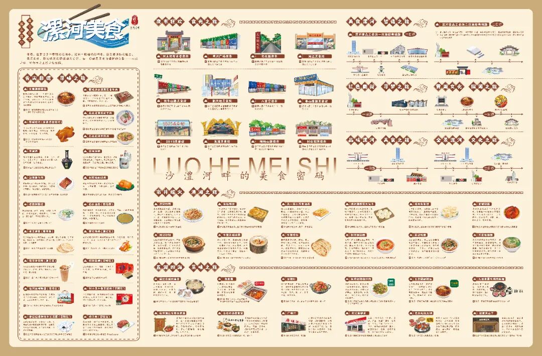 一圖在手,從清晨巷口的胡辣湯起步 —— 骨湯辛香裹著油餅,是本地人最踏實(shí)的開(kāi)場(chǎng)。順著早餐攤的熱氣,能串聯(lián)起霓虹閃爍的核心商圈,一塊熱乎醬豆餅就是漯河的煙火暗號(hào)。