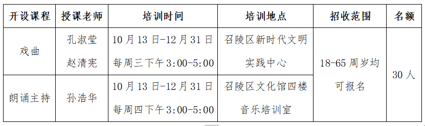 1.報名時間為9月15日至9月19日,有意參加培訓的人員,請攜帶本人有效身份證復印件1張、近期2寸照片1張前往召陵區(qū)文化館辦公室(召陵區(qū)汾河路與祥云路交叉口東南角4樓)報名,電話報名無效,需本人現(xiàn)場報名,代替報名無效,名額有限,報滿截止;報名結束后,報名人數(shù)不滿70%,則取消該班。培訓時間為10月13日至12月31日。